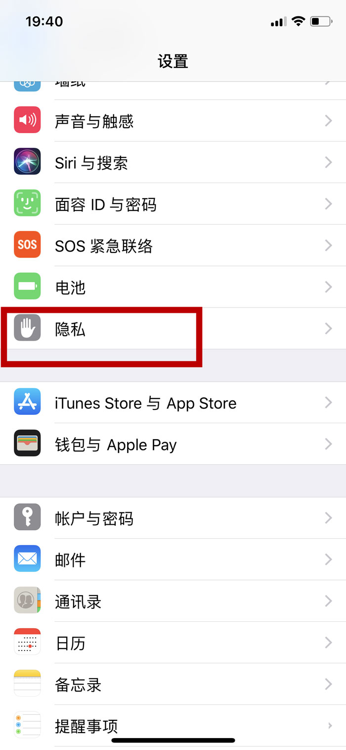 2、在设置中我们一直往上拖动,直到找到【隐私】进入