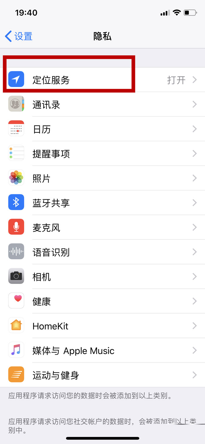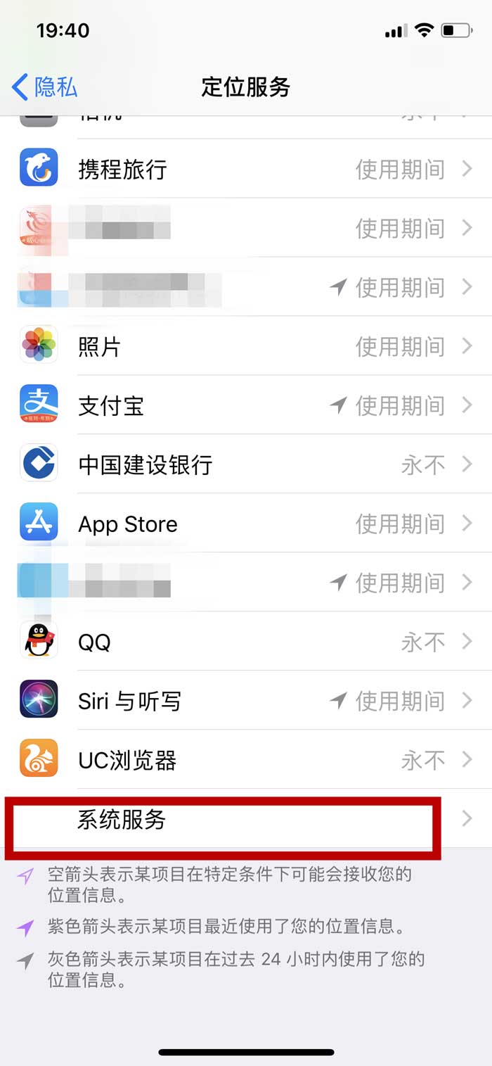4、进入定位服务后,我们需要一直往上拖动到最下方