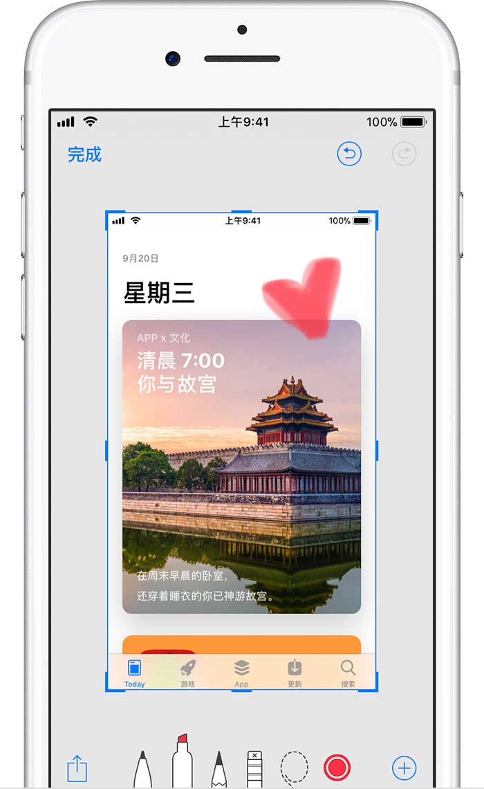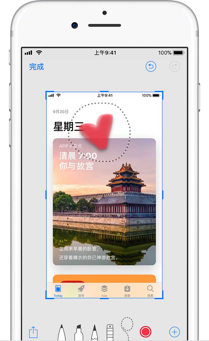 轻点显示在左下角的缩略图。随后屏幕快照会在“标记”视图中打开,您可以在这个视图中使用下述工具。