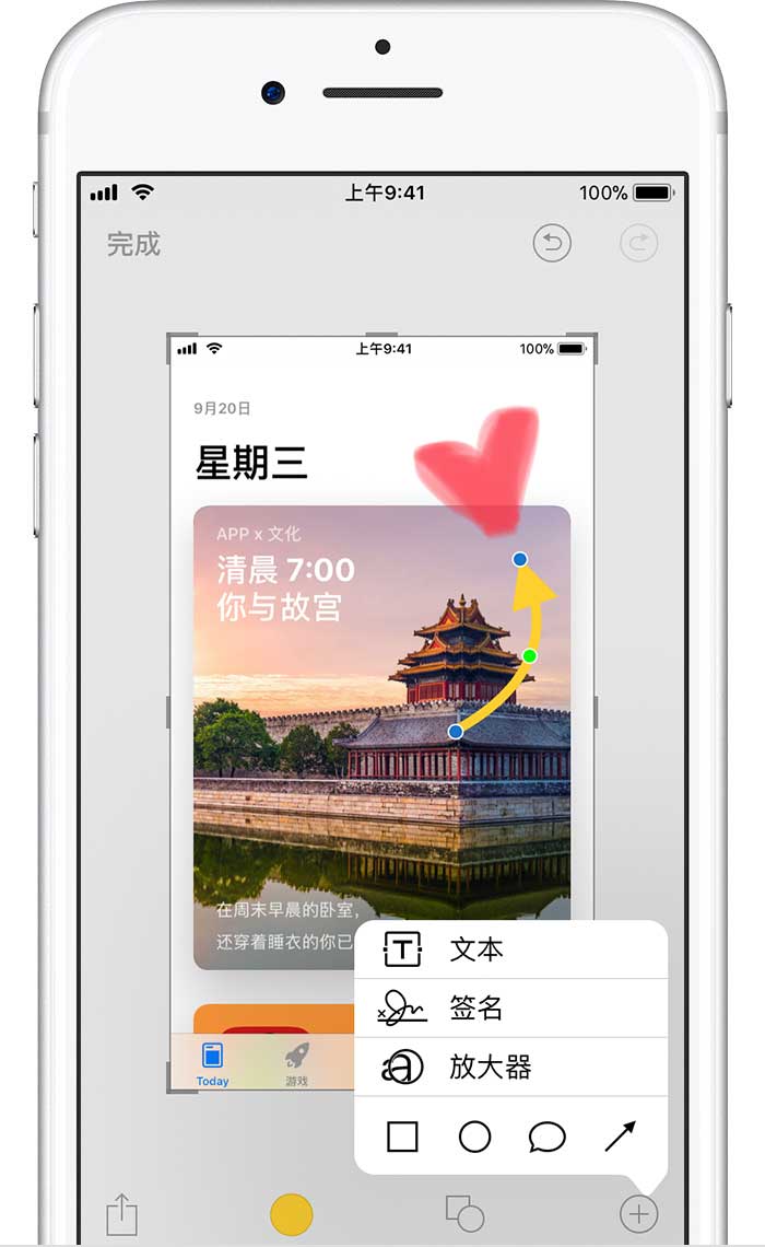 3.在 iOS 11 中,会有屏幕快照的缩略图显示在设备左下角。轻点缩略图可通过“标记”添加绘画和文本,按住缩略图可分享屏幕快照。在缩略图上向左轻扫可将它关闭。