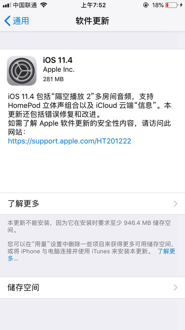 由于iOS11.4正式版固件大小是根据不同设备而不同的,如小编手中的这款设备固件大小才200多MB,当然了还是建议采用WiFi环境下进行更新,不建议采用数据流量进行更新,不换算。