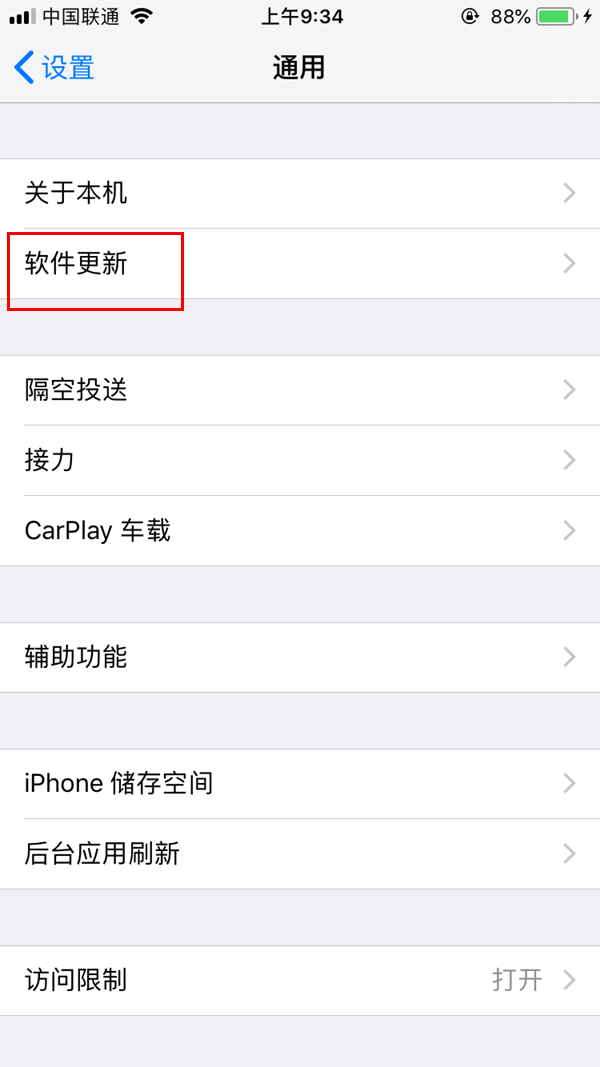 1、首先我们肯定输入进入系统更新的页面,那就是依次打开【设置】---【通用】---【软件更新】选项,如下图所示。