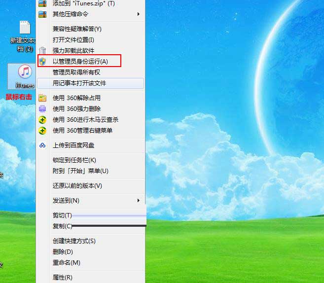 小编的方法是先重启下电脑,开机后,先不要打开iTunes,如果打开了,先关掉。然后找到iTunes这个图标,鼠标右键点击一下,选择以“管理员身份运行iTunes”。