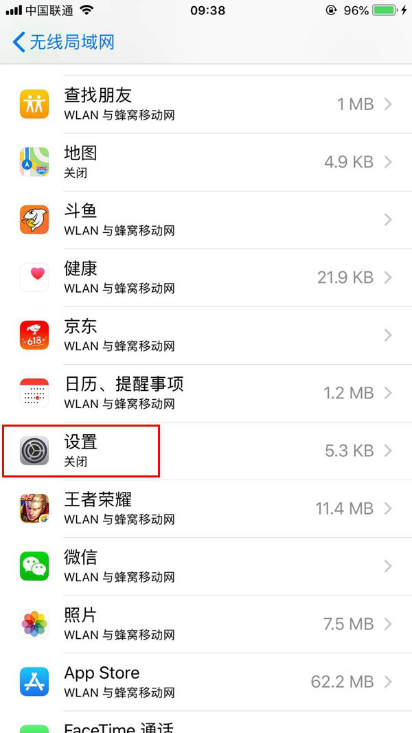 第五步:找到设置之后点击打开,我们需要选择最后一个【WLAN与蜂窝移动网】选项,之前选择的是关闭的,如下图所示。