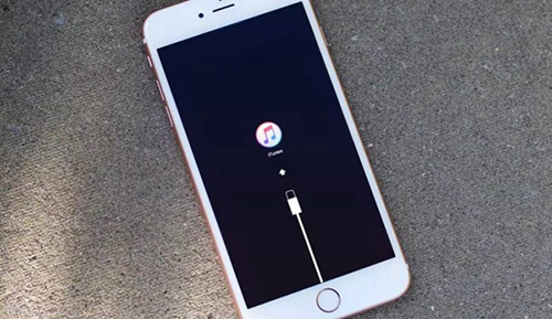 2、设备黑屏之后快速按住音量-键,不要松开,直到设备屏幕显示数据线和iTunes图标才松开。