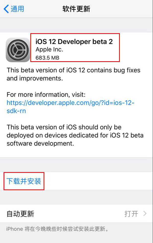 安装完成后,我们再进入到设置--通用--软件更新即可看到苹果推送了iOS12 beta2开发者预览版固件推送,如下图所示。