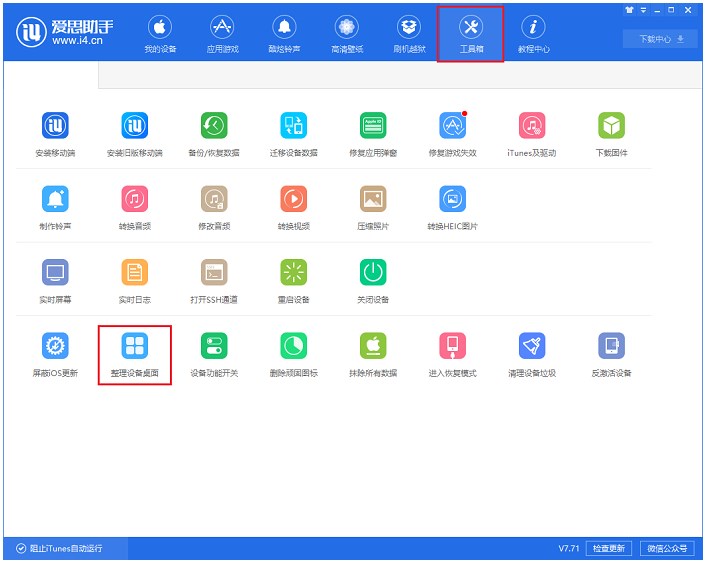 将手机与电脑连接,打开PC端爱思助手,点击【工具箱】,选择【整理设备桌面】。