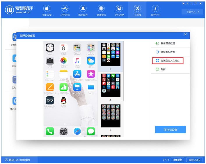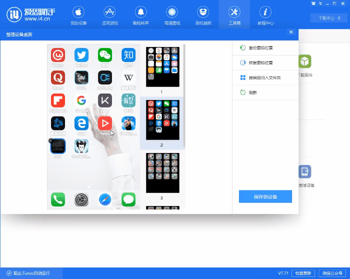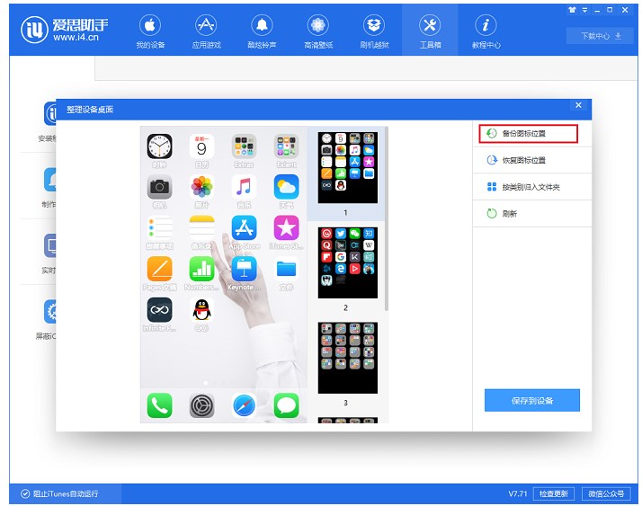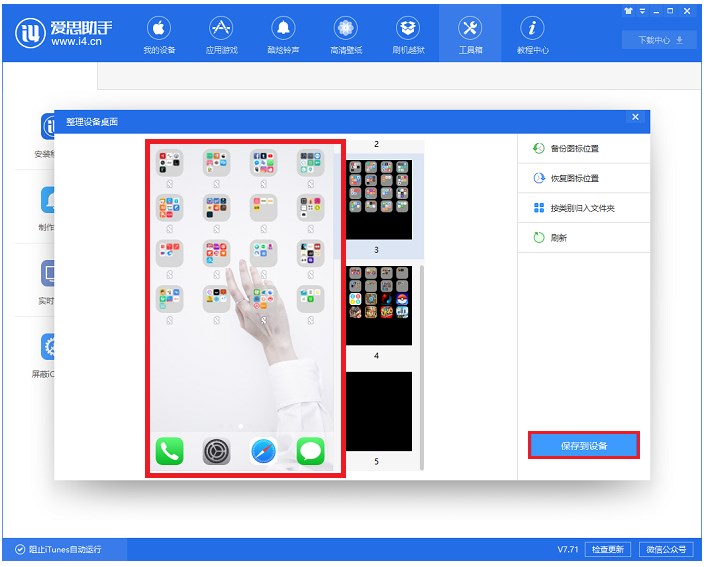 无论选择系统自动调整还是手动调整,在实时屏幕区域都可以预览图标位置,确认无误后,需要点击【保存到设备】即可保存图标调整。