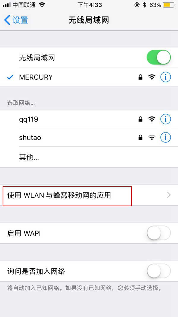 3、在无线局域界面下方找到【使用WLAN与蜂窝移动网络的应用】,点击进入,如下图所示。