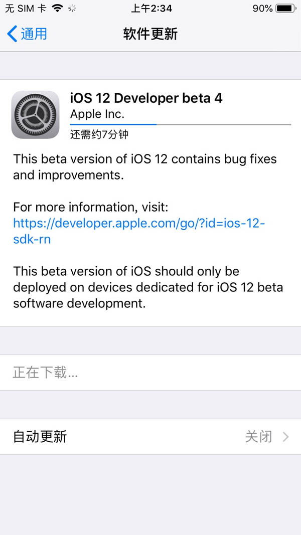 2、从iOS12 beta3到iOS12 beta4属于小版本更新,固件大小只有400-500MB,建议还是在WiFi网络环境下下载更新。