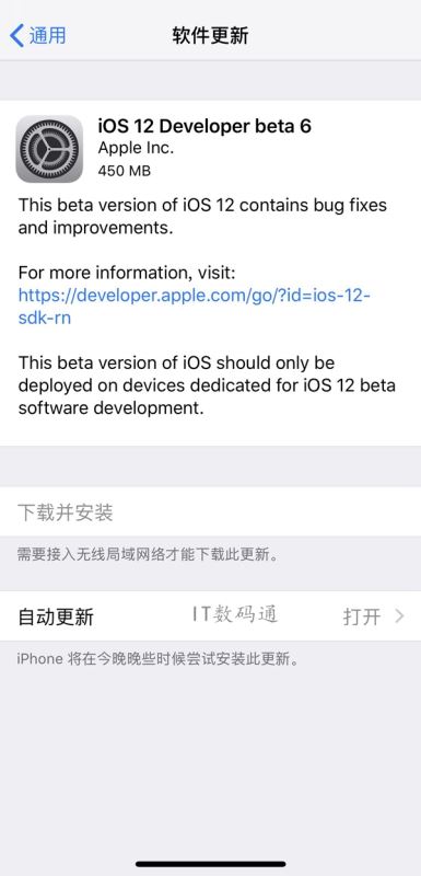 安装描述文件之后,我们再依次进入系统“设置--通用--软件更新”即可看到苹果向我们推送了iOS12 beta6开发者预览版系统推送,如下图所示。