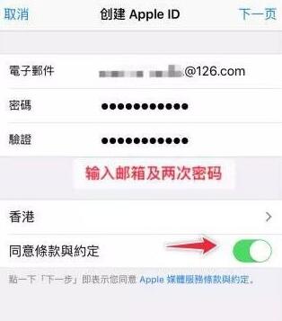 输入邮箱,两次密码,“同意条款与约定”需要开启。 Apple ID 的密码要求比较高,必须不少于 8 个字符,包括 1 个数字,1 个大写字母和 1 个小写字母,不要使用空格和连续 3 次相同的字符。