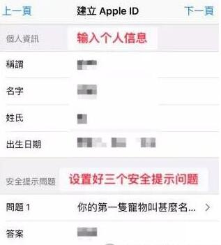 填写好之后点击下一页,进入“个人资讯”及“安全提示文字”页面,依次填写好。注意:出生日期的填写,因为苹果对未满18岁的的用户有不同政策。