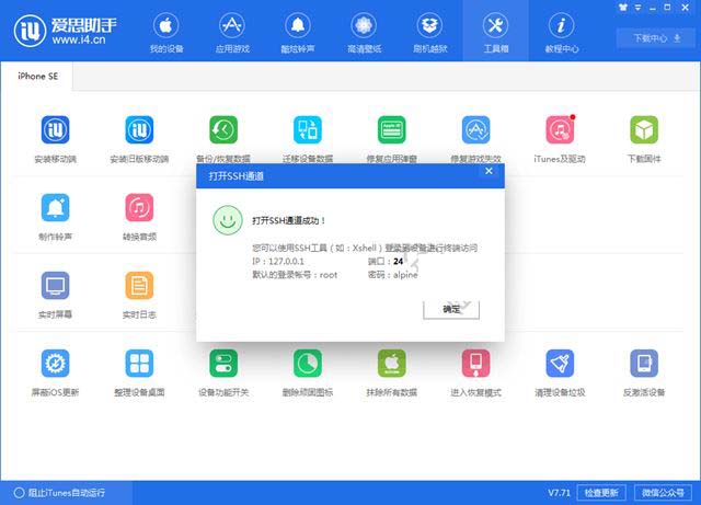 在电脑上下载爱思助手,然后将手机连接电脑,电脑打开爱思助手工具箱,打开ssh通道,若可以打开成功,则说明越狱成功。