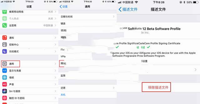 所以如果你想要回到iOS12正式版,到时候把iOS12描述文件进行移除即可。删除描述文件很简单,我们只需依次点击设置-通用-下滑至描述文件-iOS Beta Software Profile-删除描述文件,之后重启一下设备就行了。