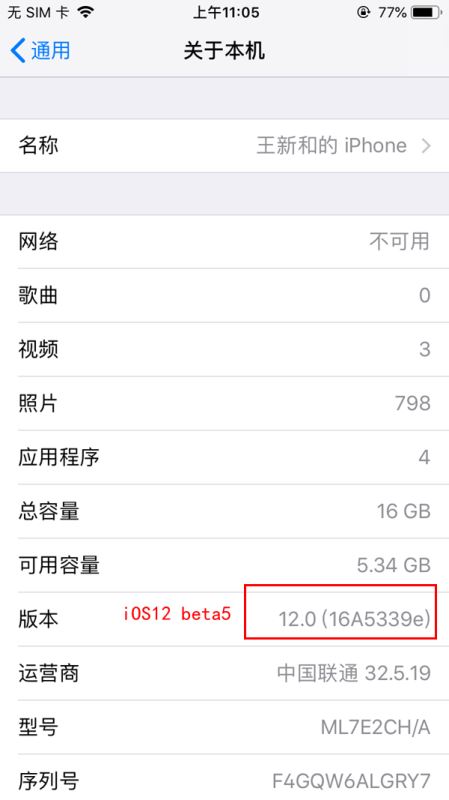 iOS12 beta5版本号为16A5339e ≒ iOS12公测版beta4