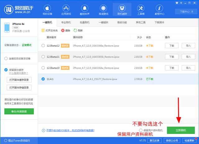 为了适合小白果粉降级,小编还是建议您使用爱思助手进行降级,这样容错率就会大大降低。使用数据线连接这个刷机工具,点击进入“刷机越狱 --> 一键刷机”界面,在下方下载IOS11.4.1固件,下载完之后,点击“立即刷机”,切记千万不要勾选“保留用户资料刷机”,否则会刷机失败或者刷机成功后无法开机。”