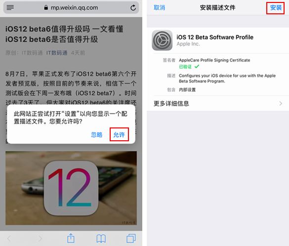 我们需要安装iOS12 GM版描述文件,如果你当前的系统版本是iOS11或iOS12测试版(之前的描述文件已被移除),那么我们就先要安装描述文件才能收到系统推送。