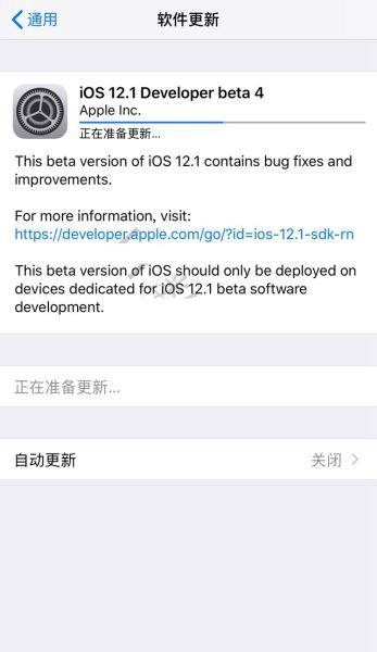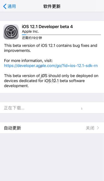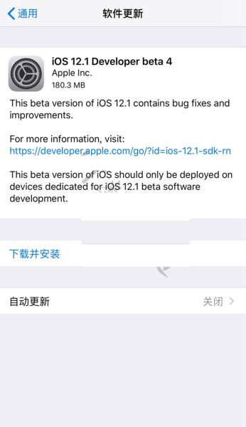 2、从iOS12.1 beta3到iOS12.1 beta4属于小版本更新,固件大小在180MB左右,建议还是在WiFi网络环境下下载更新。