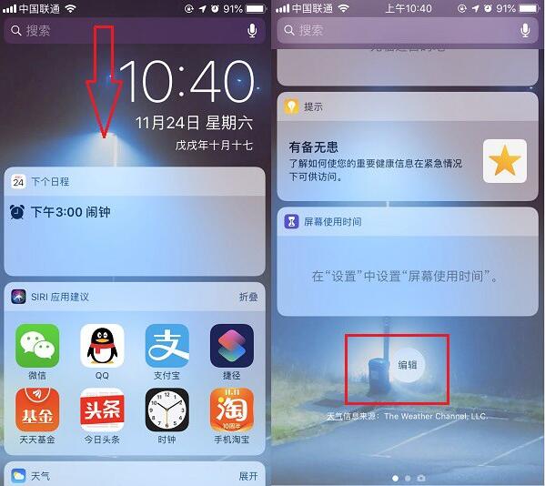 1、首先在屏幕顶部用手指下滑,打开下拉状态栏,然后滑动到屏幕底部,就可以看到「编辑」按钮了,点击“编辑”如图所示。