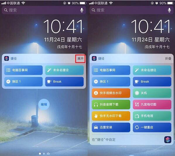 3、完成捷径小组件添加之后,再回到状态栏,就可以看到我们刚添加进来的捷径了。点击「展开」还可以看到更多捷径,如图。