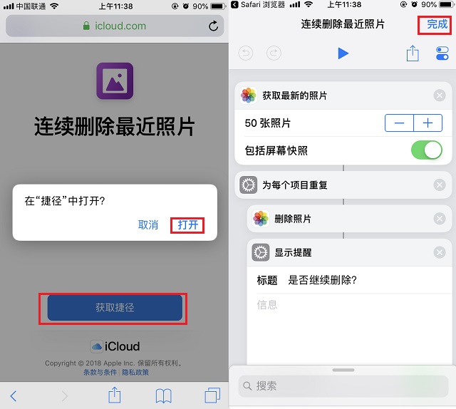 2、在后台获取 删除最近图片捷径,然后复制捷径网址,再打开iPhone手机内置的Safari浏览器,然后在粘贴捷径网址并打开。之后根据提示点击下方的“获取捷径”->“打开”->“完成”即可完成捷径安装了,如图所示。