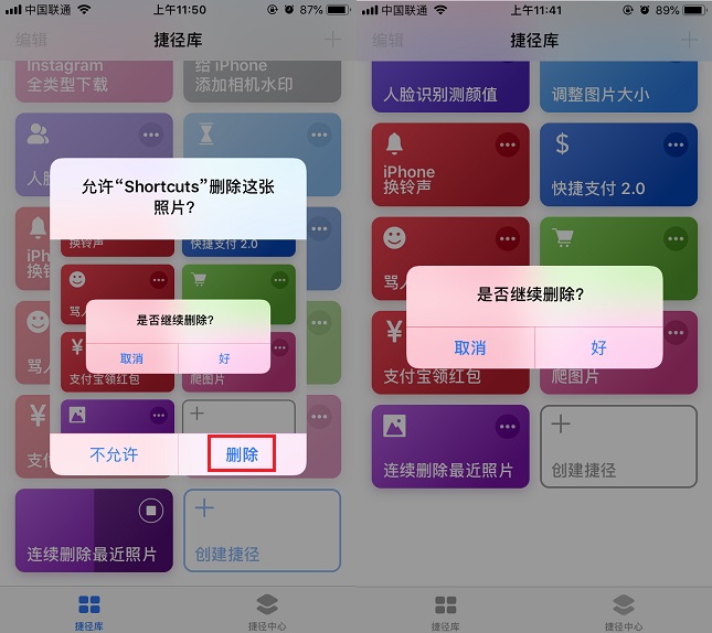 3、iOS12删除最近图片捷径安装完成后,使用非常简单,只要在捷径APP中,运行次捷径,之后就可以看到删除照片界面了,如果需要删除最近这张照片,则点「删除」,如果要跳过这张图片,则点「不允许」,接下来会提示是否继续删除,点「继续」则删除下一张图片,点「取消」则为退出捷径。