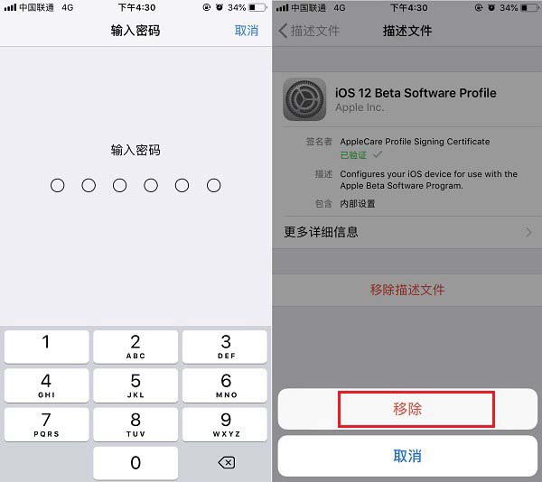 然后点击「删除描述文件」,之后需要输入一次解锁密码,然后底部会弹出确认删除「移除」选项,点击“移除”就可以成功删除描述文件了,如图所示。
