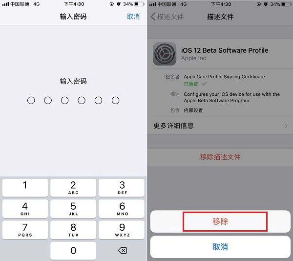 2、接下来点击「删除描述文件」,之后需要输入一次解锁密码,然后底部会弹出确认删除「移除」选项,点击“移除”就可以成功删除描述文件了。