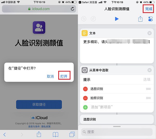 安装捷径APP之后,才可以创建捷径或安装他人共享的捷径。一般创建捷径比较麻烦,我们一般是使用网上的共享捷径,只需复制捷径地址,然后在苹果手机内置的Safari浏览器打开,然后根据提示,点击“打开”,再点右上角的“完成”即可成功添加捷径项目,如图所示。