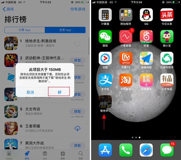 1、在移动网络下,APP Store应用商店下载超过150M的应用,当提示“此项目大于150MB,需要连接Wifi才能下载”时,直接点击好,之后在桌面可以看到一个灰色等待下载的这个APP,如图所示。