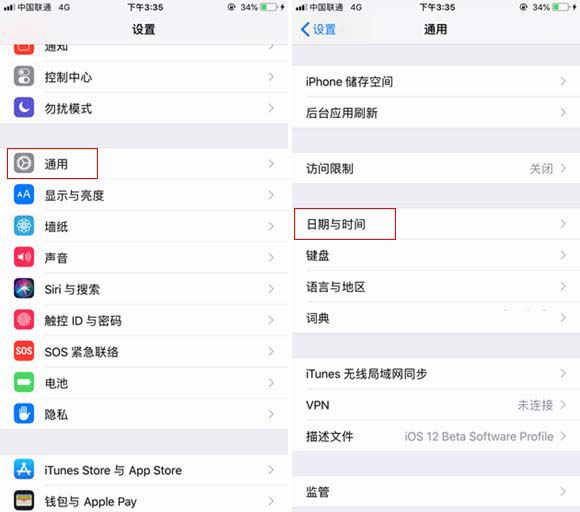 2、然后依次进入iPhone的 「设置」-> 「通用」->「时间与日期」设置,如图所示。