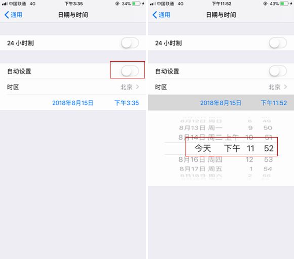3、接下来首先关闭「自动设置」时间开关,然后将时间设置的比当前时间更晚一些,比如设置为第二天或今天更晚一些的任意时间段,如图所示。