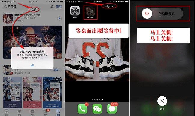1、在流量网络下,在APP Store应用商店下载超过150M的应用,在弹出的提醒中,同样点击“好”,之后桌面同样会出现这个待下载APP的图标。此时马上将iPhone关机,如图所示。