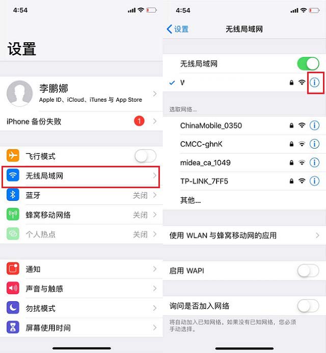 1、进入iPhone的 「设置」,然后打开「无线局域网」设置,之后点击已经连接的WiFi网络后面的「i」图标,如图所示。