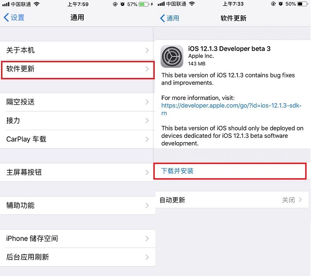1、在iOS设备中,依次进入「设置」-> 「通用」-> 「软件更新」,之后就可以检测到最新版的 iOS12.1.3 beta3 测试版更新了,点击下方的「下载并安装」,如下图所示。