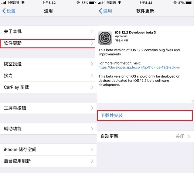 安装测试版描述文件后,重启设备之后,同样再进入 设置->通用->软件更新,也可以和开发者或测试版用户一样,通过OTA方式,在线升级到iOS12.2 beta3。除了通过安装描述文件升级,大家也可以通过刷机的方式升级,只不过操作比较麻烦,需要借助电脑、下载固件,一般不建议刷机。
