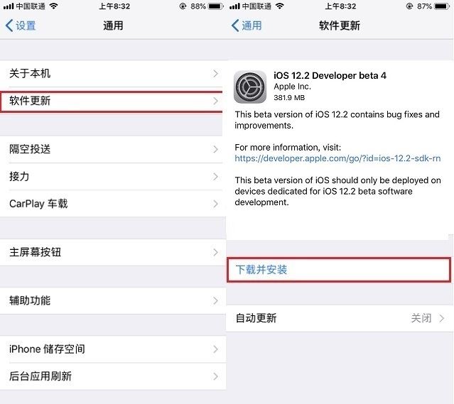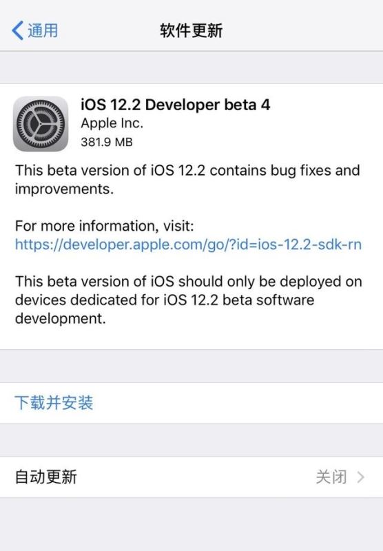 ②安装测试版描述文件后,重启设备之后,之后和测试版用户一样,同样再进入 设置->通用->软件更新,就可以检测到 iOS12.2 bete4更新了,点击下载并安装,根据提示完成即可。