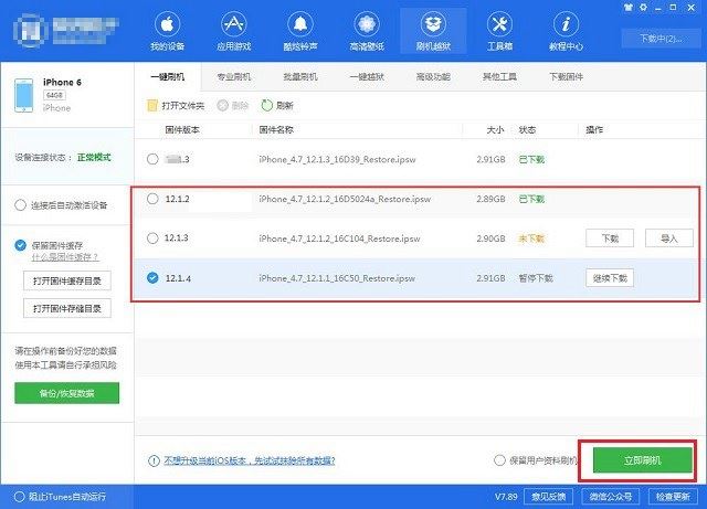如果是使用第三方工具刷机,如爱思,操作步骤相当会更简单一些,无需单独去下载固件,可以直接在助手工具界面中操作,根据当前可以降级的系统,一键刷机(刷机前也需要注意备份重要数据),如图所示。