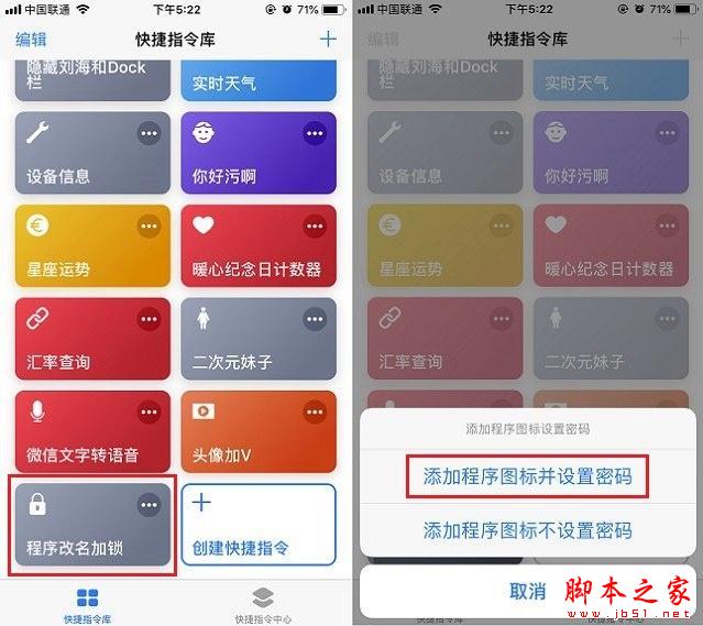2、捷径安装完成后,打开捷径APP,点击打开运行刚安装好的「程序改名加锁捷径」,之后在底部弹出提示中点击「添加程序图标并设置密码」,如下图所示(如果仅是改图标,不需要设置密码,则选择第二项)。