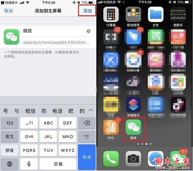 6、最后在添加主屏幕页面,点击右上角的「添加」,之后桌面上就可以看到新生成的APP图标以及名称了,如下图所示。