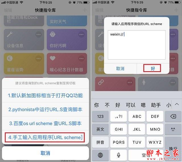 4、接下来需要输入捷径APP的URL,这里可以选择「手工输入应用程式的URL」,比如调用微信的URL为:weixin://。其它APP的URL在获取到捷径的时候,会一并看到哦。