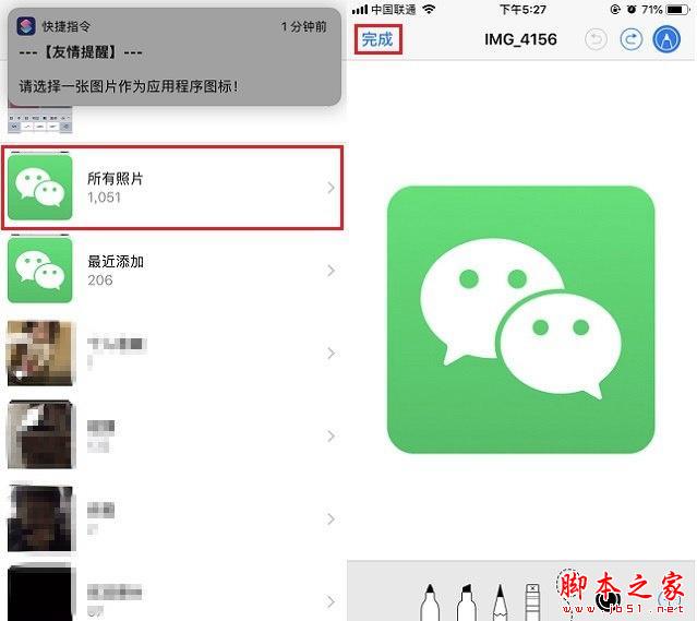 4、接下来会进入从相册选择APP图标页面,这个需要提前在网上找一个APP图标图片,下载保存到相册,然后这里选择使用即可。选择自定义的APP图标之后,点击左上角的「完成」进入下一步,如下图所示。