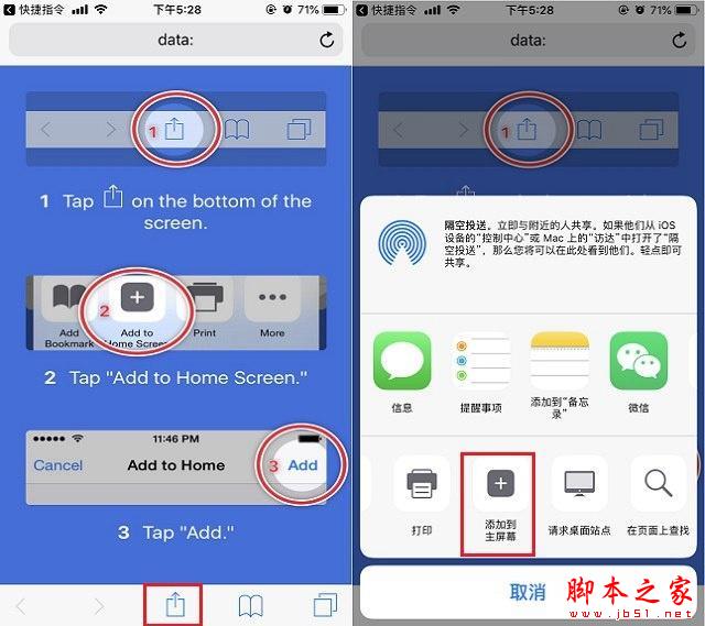 5、接下来会进入data图标设置页面,主要是将图标添加到桌面。操作很简单,点击下方中间的分享图标,在弹出的底部菜单中,找到并点击「添加到主屏幕」进入下一步,如下图所示。