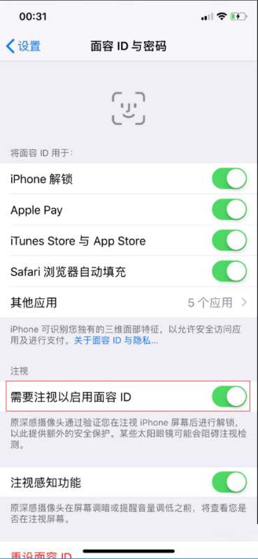 勾选这个功能后,手机摄像头感知你是否在注视手机,如果你看着屏幕,才会启用面容ID,这里刷脸才会解锁