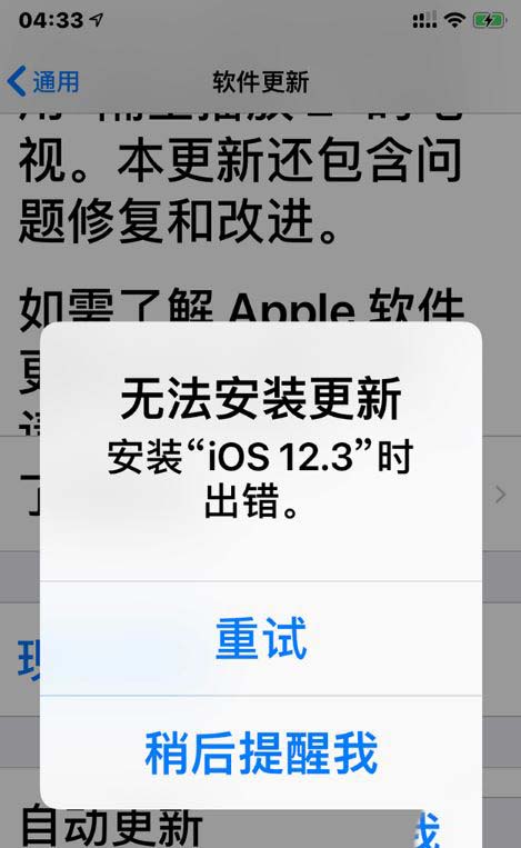 准备给Phone XR更新iOS12.3正式版固件,可是试了好几次点击”现在安装”,都弹出无法安装更新的错误提示框,如下图
