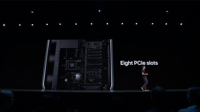 得益于志强处理器的64条PCI-E通道数,全新Mac Pro提供了8条物理PCI-E插槽,其中3条为单槽位(一条x16、两条x8),4条为双槽位(x16 gen3或x8 gen3),均为全长尺寸,还有一条为半高尺寸,默认安装了苹果的接口扩展卡,而这些插槽除了给用户可以自行安装需要的扩展卡外,苹果特别提供了不同的PCI-E扩展卡模块,名为MPX。