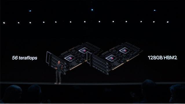 目前公布MPX模块主要为显卡,内置为定制的PCB,上面除了一般PCI-E接口外,还自带供电插口(最大500W)和DisplayPort显示导向,起步显卡为AMD Readon Pro 580X,更高为Pro Vega II,到最高可选双芯的Pro Vega II Duo,提供最大56 TFLOPS和128GB HBM显存,这是为了8K分辨率的3D动画准备的。