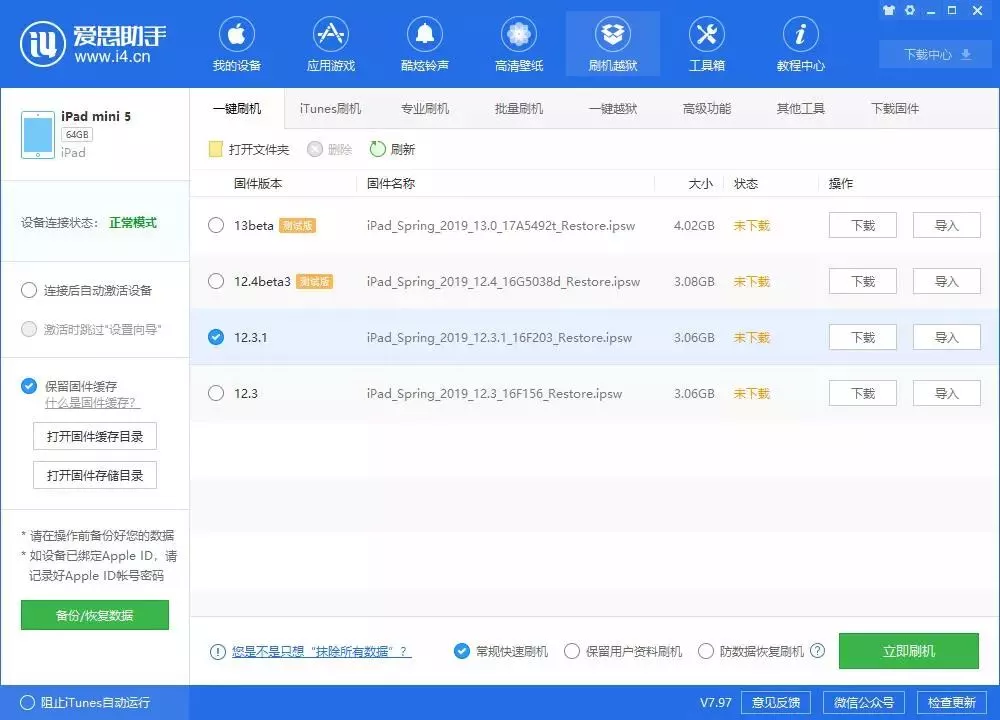 2、在可降版本中选择您要降的 iOS 版本,勾选“常规快速刷机”,然后点“立即刷机”,之后爱思助手会自动帮您下载固件并刷机;