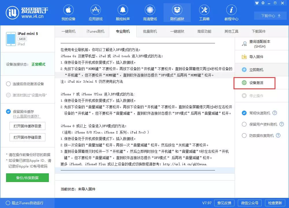 4、移动设备开机后,可以点击“专业刷机”-“设备激活”来激活设备,也可以在设备上手动激活。